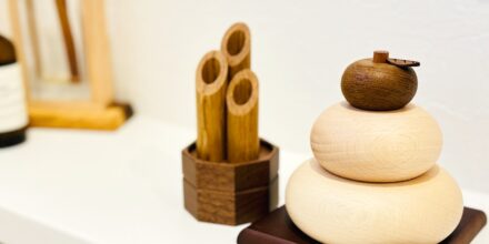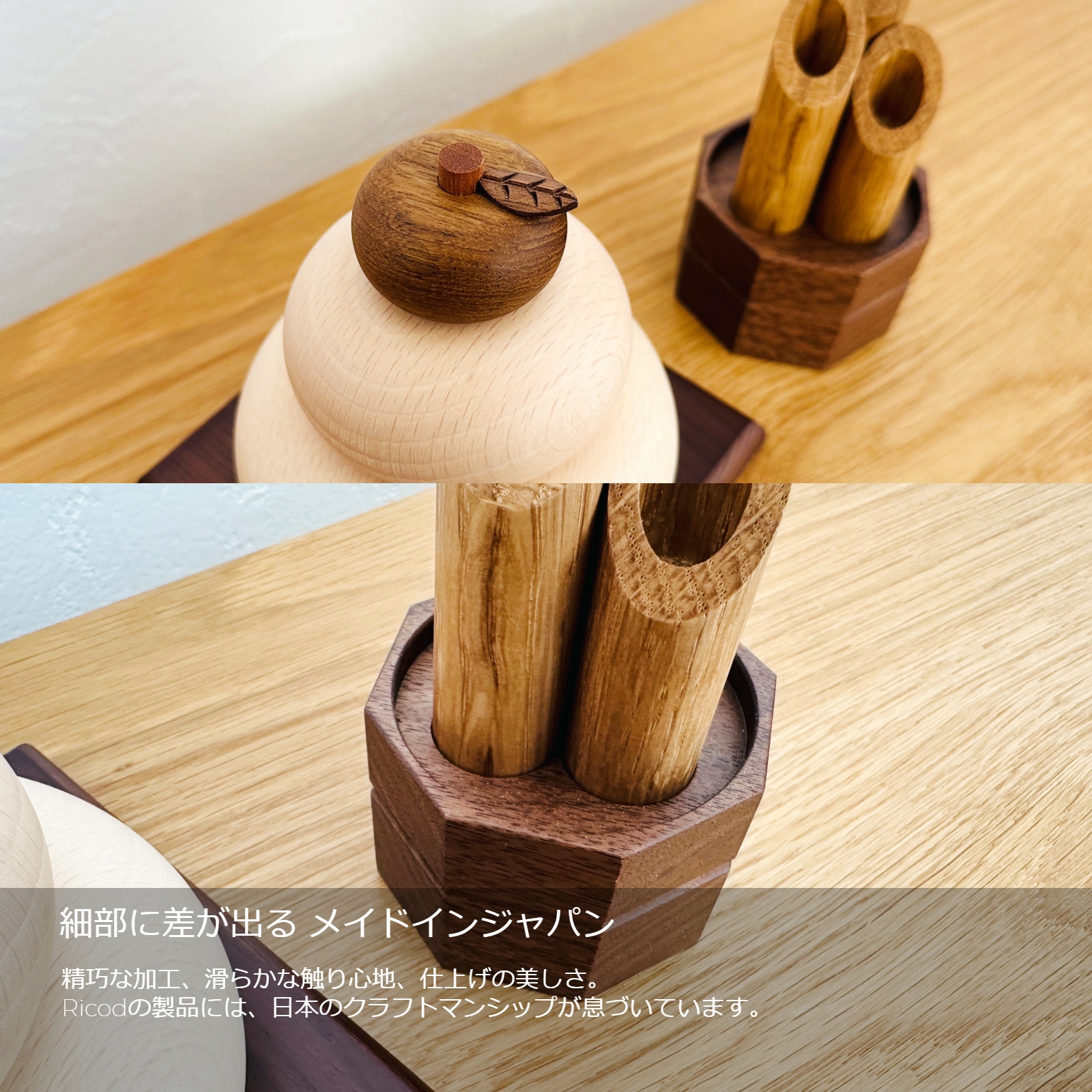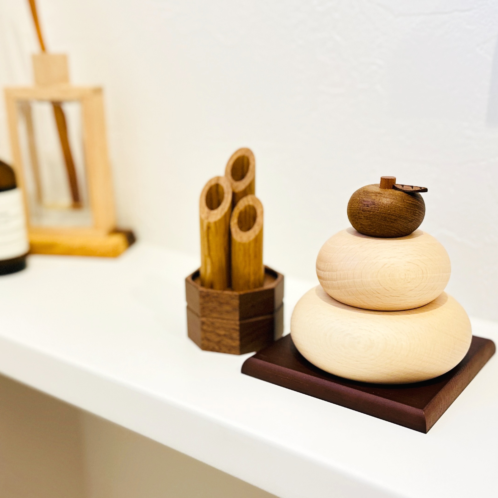 銘木を使い、どこにでも飾りたくなるようなオシャレな木製鏡餅&門松のオブジェに仕上げました。